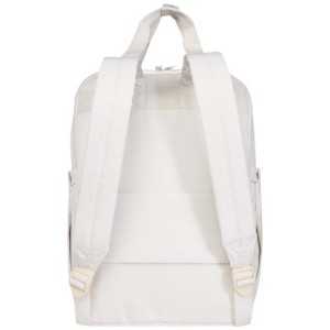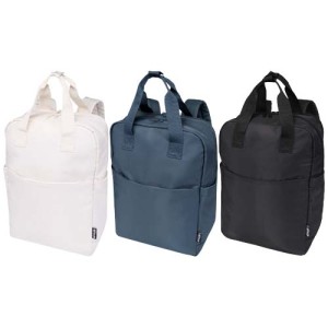 The Trip Aware™ recycled travel laptop backpack is a compact, lightweight backpack designed for streamlined travel and everyday use. Made from durable 290D twill polyester with a soft knitted backing and lined with RPET 210D/PU, it combines functionality with a clean, practical design. It features two side pockets for water bottles, dual carry handles, and comfortable shoulder straps. The front zip pocket includes organised storage for a passport, pens, and a ribbon for keys, while the main compartment fits a notebook or tablet. A separate 14” laptop compartment and a trolley sleeve on the back make it especially suitable for travel. Each bag also comes with an Aware™ tracer. This innovative feature allows users to trace the origins and journey of their item through a QR code, enhancing transparency in the supply chain and fostering a stronger connection between the product and its production process. Volume capacity: 9 litres.