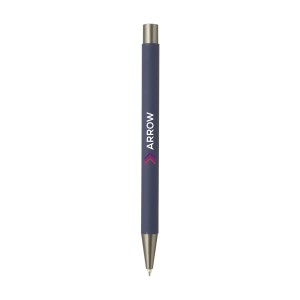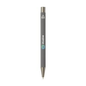 Blue ink ballpoint pen with a barrel made from 100% RCS-certified recycled aluminium. The barrel has a rubberised soft touch finish. The simple design without a clip gives the pen a modern, elegant look. RCS-certified. Total recycled material: 81%. By using recycled aluminium, fewer new raw materials are used during the production of this product. This means less energy consumption and less use of water.