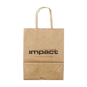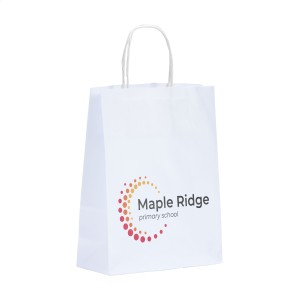 TSturdy paper gift bag in A5 format, ideal for promotional campaigns, trade fairs, or as retail packaging. It features short, strong, paper-twisted carrying loops, a side fold and folded bottom for extra ease of use. The front and back can be fully personalized with a full-colour print – a budget-friendly, practical, and eye-catching way to showcase your brand. 100% recyclable. Available in white and brown.