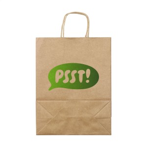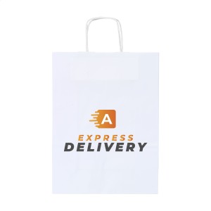 Sturdy paper gift bag in A4 format, ideal for promotional campaigns, trade fairs, or as retail packaging. It features short, strong, paper-twisted carrying loops, a side fold and folded bottom for extra ease of use. The front and back can be fully personalized with a full-colour print – a budget-friendly, practical, and eye-catching way to showcase your brand. 100% recyclable. Available in white and brown.