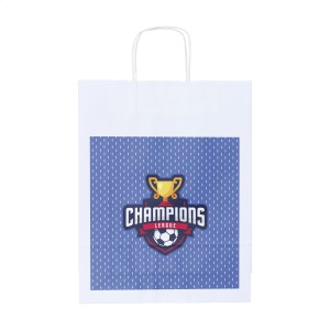Sturdy paper gift bag in A3 format, ideal for promotional campaigns, trade fairs, or as retail packaging. It features short, strong,paper-twisted carrying loops, a side fold and folded bottom for extra ease of use. The front and back can be fully personalized with a full-colour print – a budget-friendly, practical, and eye-catching way to showcase your brand. 100% recyclable. Available in white and brown.
