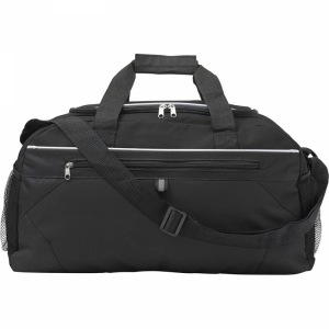 Polyester (600D) sports/travel bag with front zipped pocket and a mesh pocket on both sides.