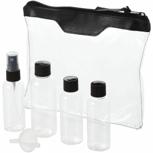 Munich airline approved travel bottle set. Airline approved toiletry bag which you can bring onboard. Including 2 x 50 ml bottle, 1 x 90 ml bottle and 1 x vaporizer and funnel. Bottles, vaporizer and funnel packed in polybag, comes separately from pouch. Decoration not available on components. PVC Plastic.