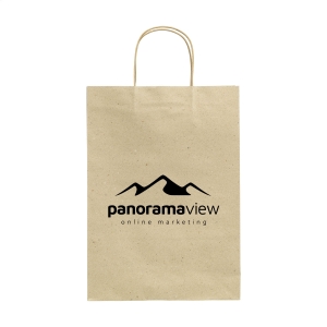 Sturdy ECO paper gift bag (size L) made from recycled grass paper (120 g/m2). Due to the use of natural materials, irregularities in the paper can be seen and/or felt. This gives the product a beautiful natural look. The bag has two short paper carrying loops, a folded bottom and a side fold. No trees are cut down for the production of this bag.