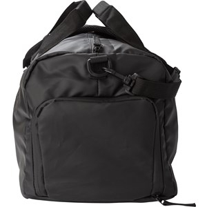 Water repellent sports bag with reinforced base and a shoe compartment, adjustable straps and short handles.