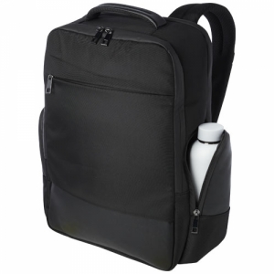 The sleek, large and sturdy GRS certified Expedition Pro laptop backpack is a perfect companion for professionals on-the-go. It is made from water repellent 900D RPET, coupled with premium PU elements and RPET lining. It features a dedicated 15.6" laptop compartment, a tablet sleeve, a spacious main compartment with integrated leak-proof pocket for toiletries, multiple organisational and side pockets, a zipped front pocket and a hidden pocket right beneath the luggage strap on the back. Constructed with padded and adjustable shoulder straps, an integrated card sleeve pocket, a sunglasses loop, moulded air mesh backing as well as a padded handle, ensuring maximum carrying comfort and convenience. Volume capacity: 25 litres. PVC free.