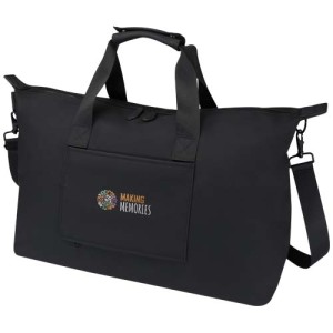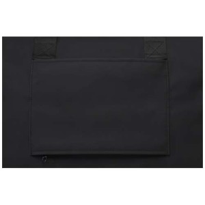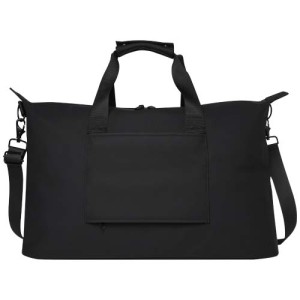 The Turner duffel bag is made of 51% GRS certified recycled plastic and the lining is made of 100% GRS certified RPET. The duffel features a padded 15.6" laptop compartment, an internal strap for securing a water bottle, and a zipped pocket for smaller items. Additionally, a luggage strap on the back allows for easy attachment to rolling luggage, making it a convenient travel companion. The duffel can be carried by the 2 short handles, or by the expandable and detachable shoulder strap that can be adjusted for maximum comfort. Volume capacity: 36 litres.