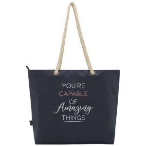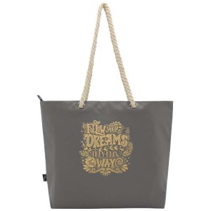 The Panama cooler tote bag is made from GRS certified recycled polyester, and features a large zipped main compartment, and high-quality aluminium foil and cotton cord handles. Suitable for various activities such as grocery shopping or for a day at the beach or in the park. Volume capacity: 23 litres. Resistance up to 10 kg weight. PVC free.
